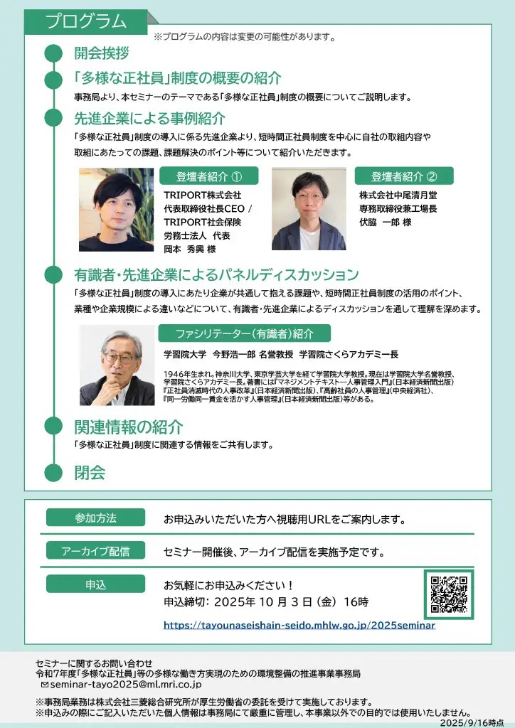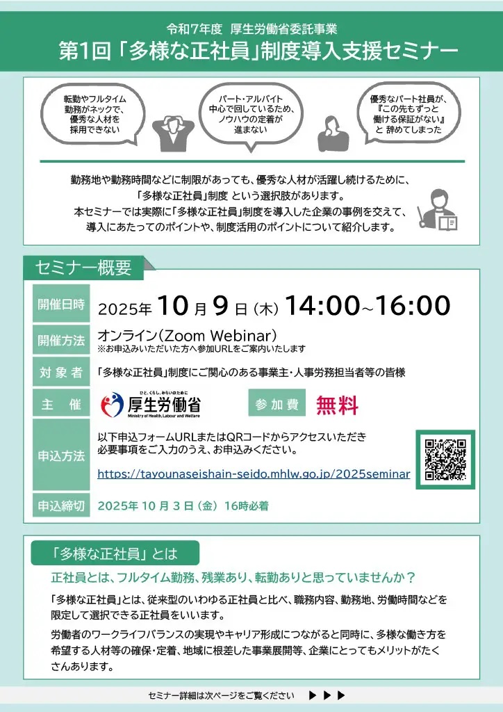 - 対象者 :「多様な正社員」制度にご関心のある事業主・人事労務担当者の皆さまなど